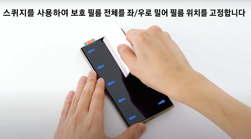 이제 AR 보호필름을 다 붙이셨다면 스퀴지를 사용해서 보호 필름 전체를 좌/우로 밀어 위치를 고정 합니다.