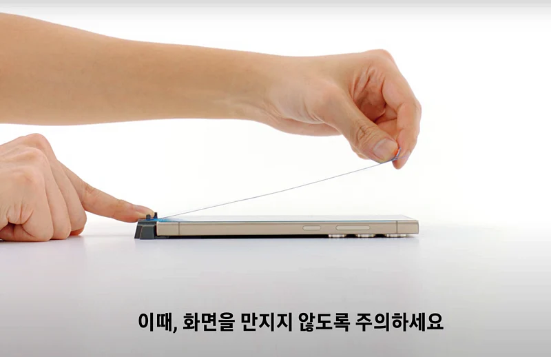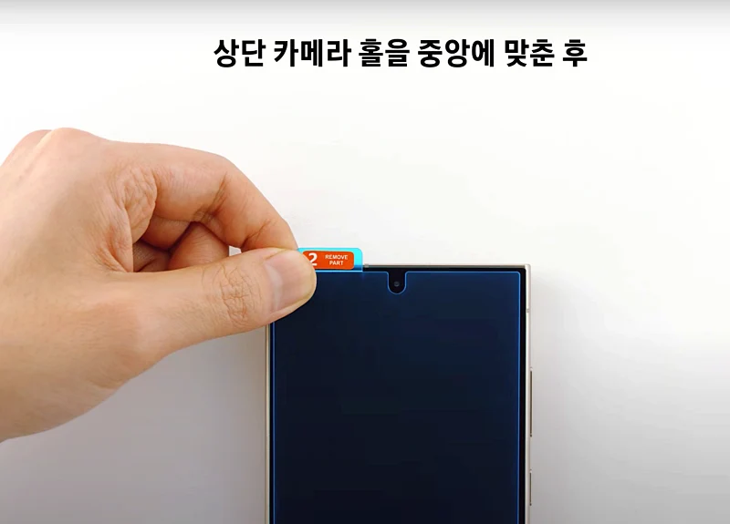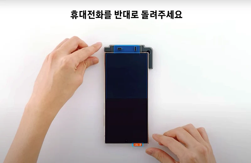 어플리케이터에 있는 2개의 파란색 고정용 보호테잎을 제거 합니다. 보호테잎을 제거하면 끈끈하기 때문에 여기에 갤S25 울트라를 밀착시켜서 고정할 수 있습니다.