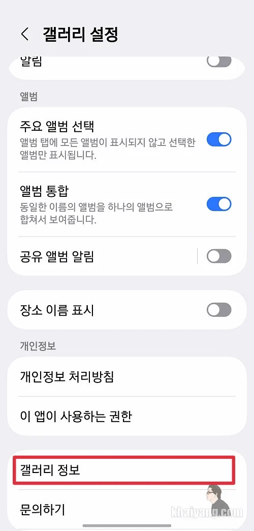 갤러리 설정에서 하단에 있는 갤러리 정보를 선택 합니다.