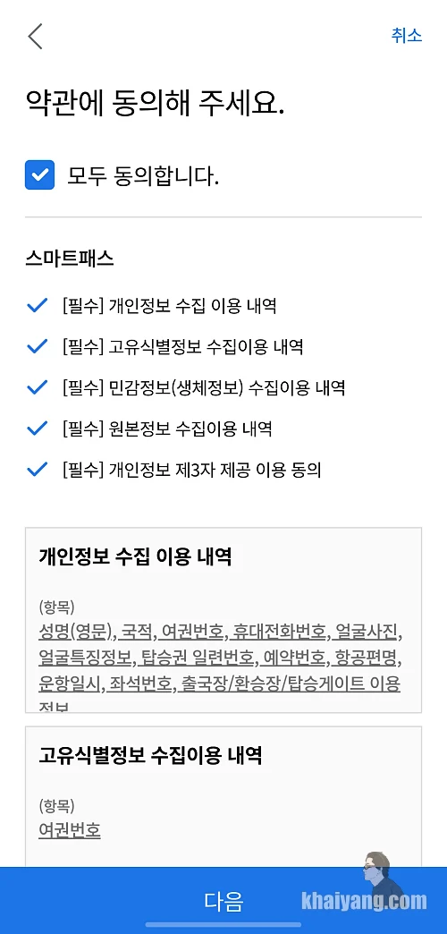여권 정보와 맞는지 확인 후 맞으시면 다음으로 넘어갑니다.