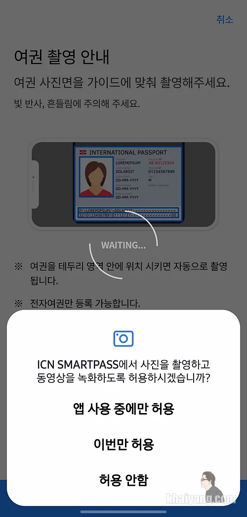 앱 사용중에만 허용으로 하고 시고 여권을 스캔 합니다.