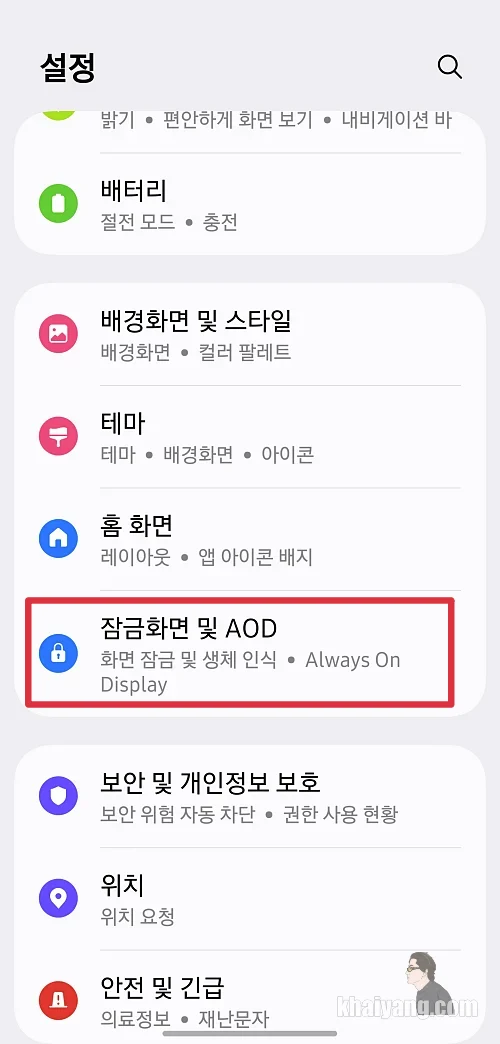 설정 화면에서 잠금화면 및 AOD 항목을 선택 합니다.