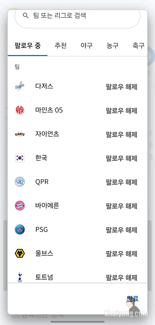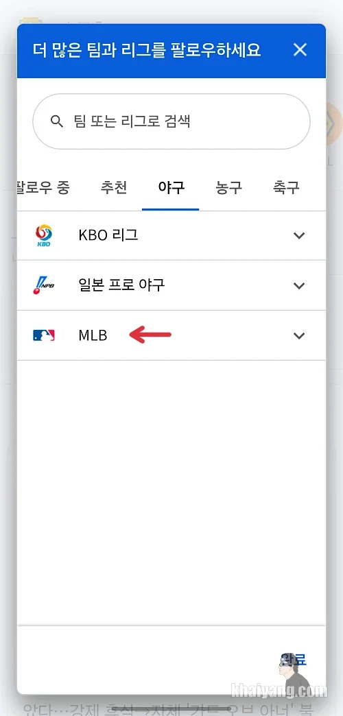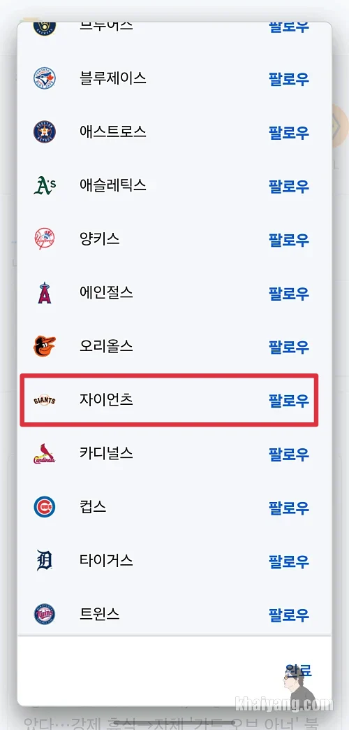 팔로우 목록에 해외 축구 팀만 있다가 이제 MLB 팀이 추가 되었습니다.
