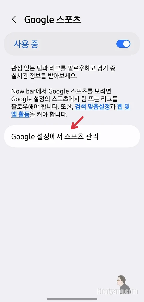 구글 설정에서 스포츠 관리를 선택 합니다.