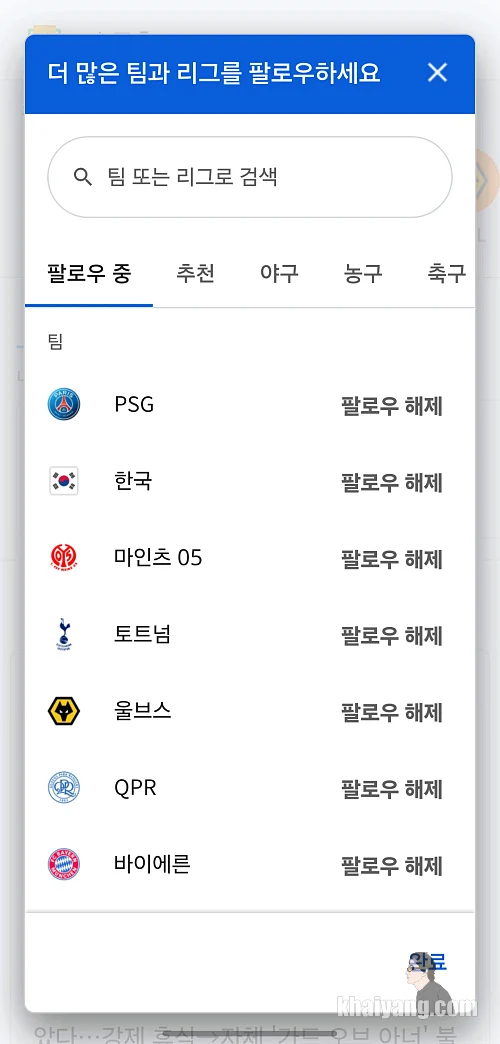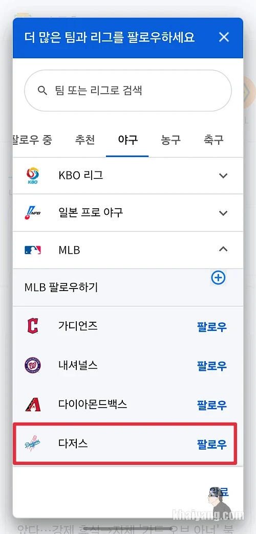 팔로우 목록에 해외 축구 팀만 있다가 이제 MLB 팀이 추가 되었습니다.