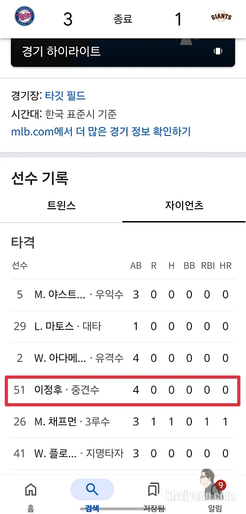 아쉽게도 이날은 이정후 선수가 4타수 무안타를 기록했습니다.