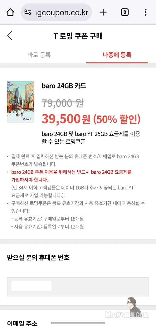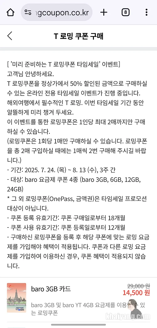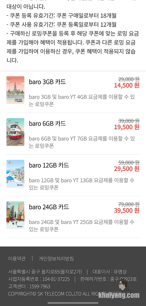 사용 가능한 로밍 상품은 바로(baro) 요금제의 총 4가지 데이터 용량 3GB(2만9000원) / 6GB(3만9000원) / 12GB(5만9000원) / 24GB(7만9000원)쿠폰을 50% 할인된 가격에 제공합니다.