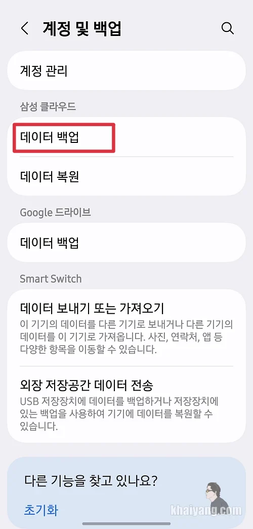 설정 -> 계정 및 백업 -> 데이터 백업 항목을 선택 합니다.
