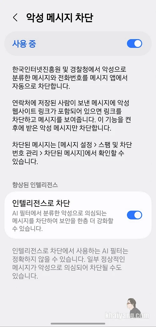AI 필터에서 분류한 악성으로 의심되는 메시지를 차단하여 보안을 한층 더 강화할 수 있습니다.