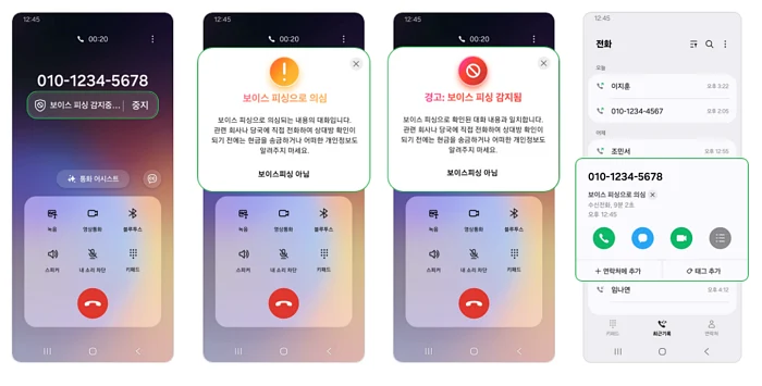 보이스 피싱 의심 알람 기능은 알 수 없는 번호와 통화할 때 보이스 피싱 의심 여부를 AI 기반으로 실시간으로 탐지해 알려줍니다.
