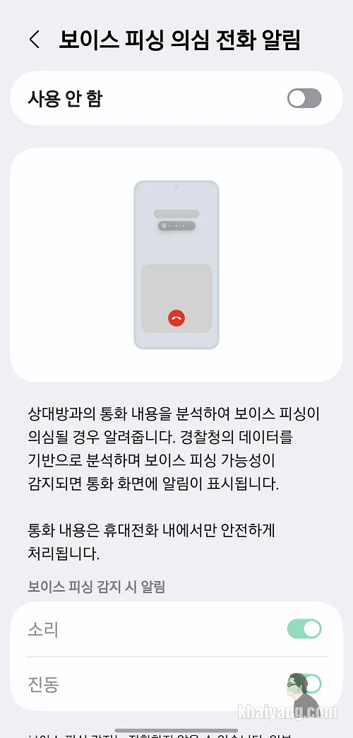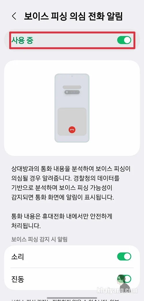 기능을 켜면 저장되지 않은 번호와 통화 할 때, 통화 화면에 감지 중 이라는 팝업이 표시되며 보이스 피싱 탐지가 동작합니다.