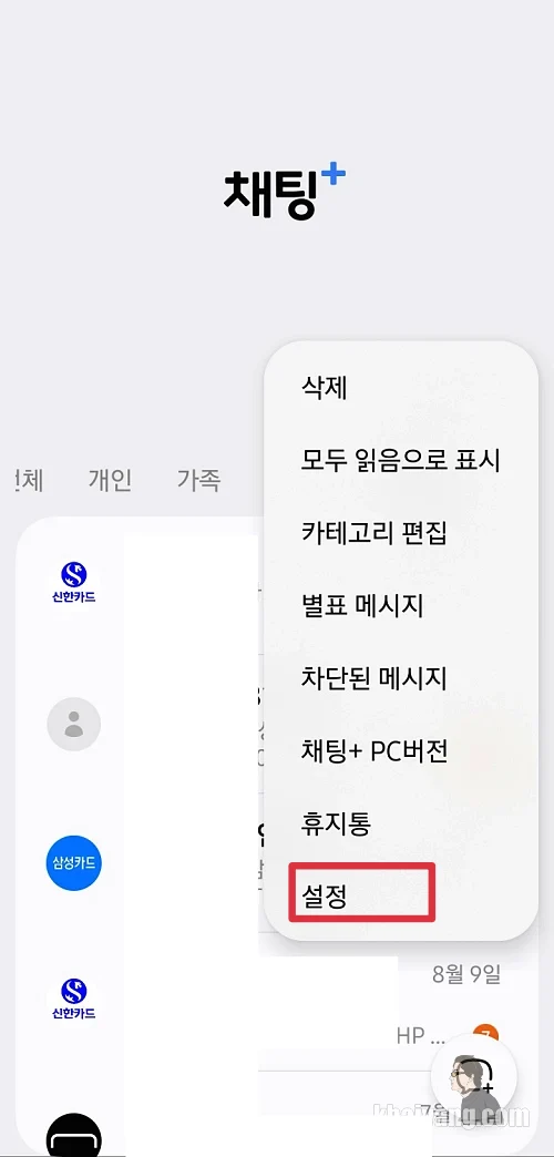 문자 앱에서 상단 오른쪽 점3개를 클릭 후 나오는 화면에서 설정을 눌러주세요.