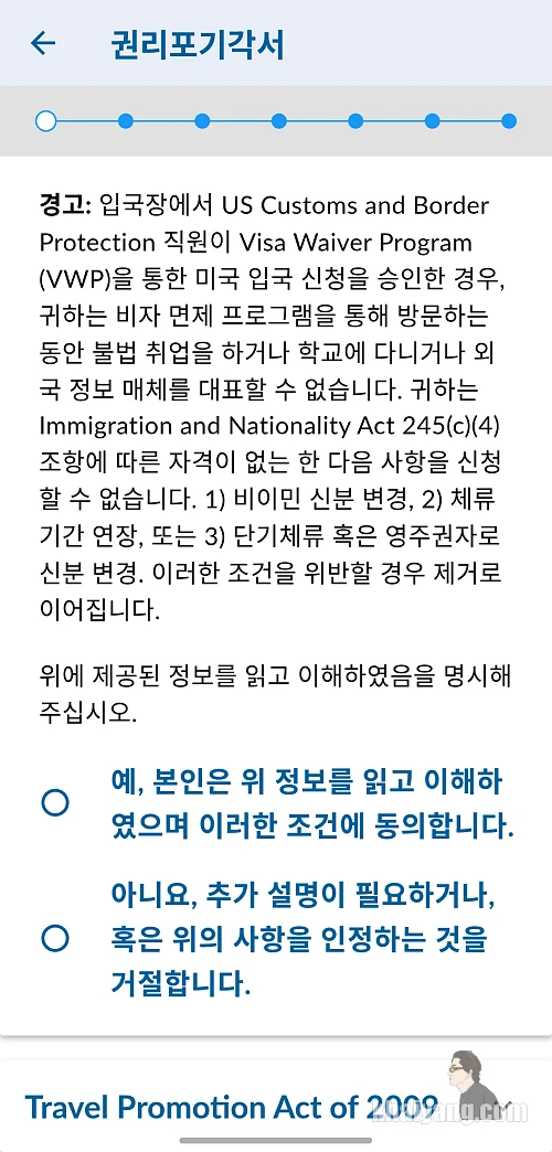 권리포기 각서 같은 뭔가 후덜덜한 내용도 나오지만 미국에 들어가기 위해서는 동의 버튼을 선택하셔야 합니다.