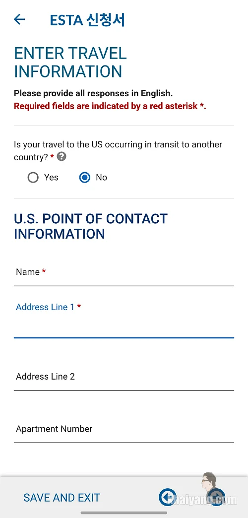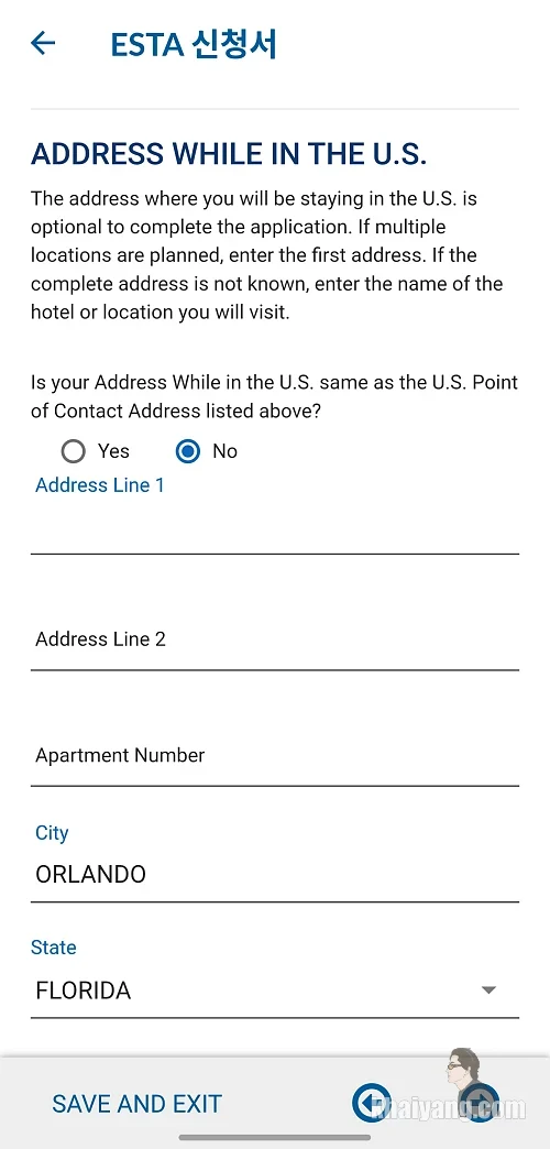 미국 여행 할시에 투숙할 주소를 입력해야 합니다.
