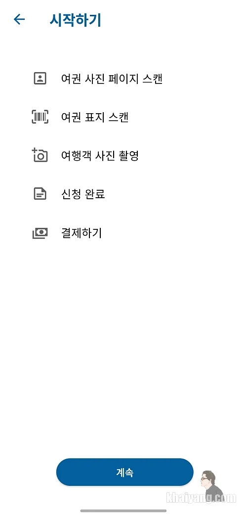 여권사진 페이지 스캔 - 여권 표지 스캔 - 여행자 사진 촬영 - 신청완료 - 결제 하기 순으로 진행을 합니다.