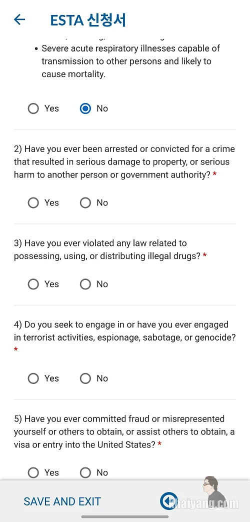 미국 들어갈때 범죄와 관련해서는 거짓말 했다가 입국 금지가 될 수 있으니 정직하게 체크를 하시는게 좋습니다.