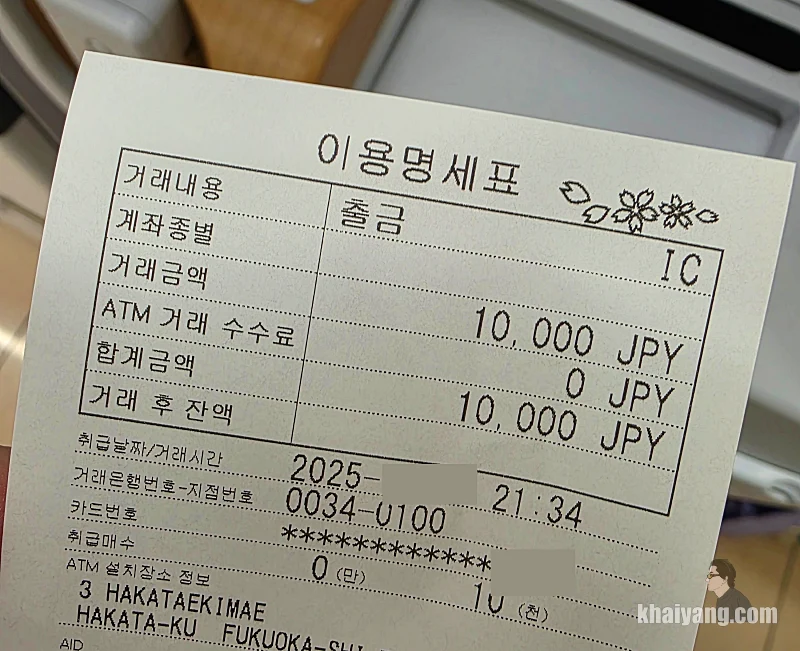 인출하고 받은 영수증에 ATM 수수료 0원이라고 표시된 것을 볼 수 있습니다.
